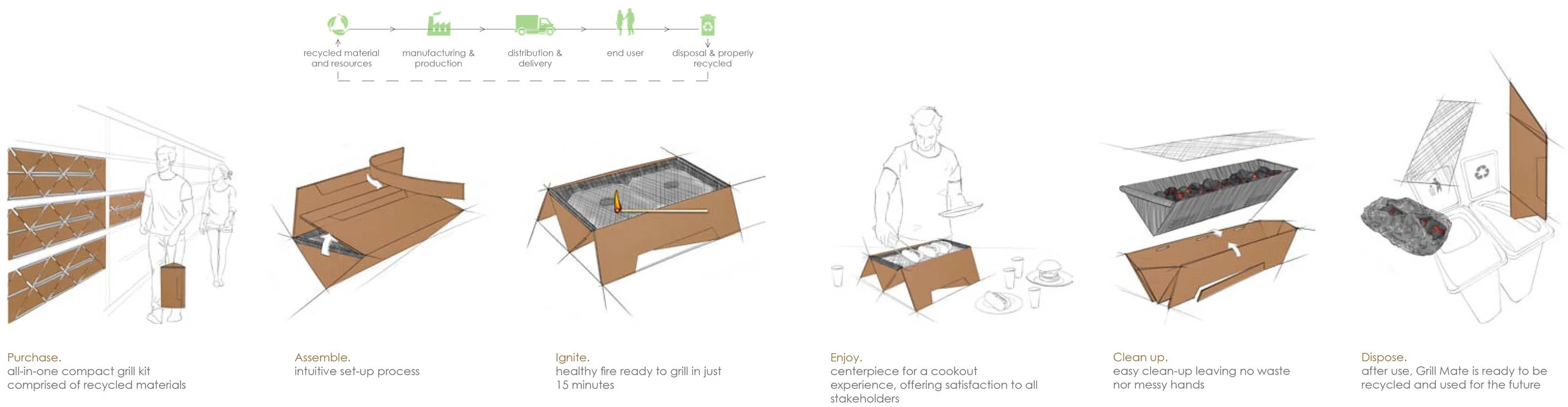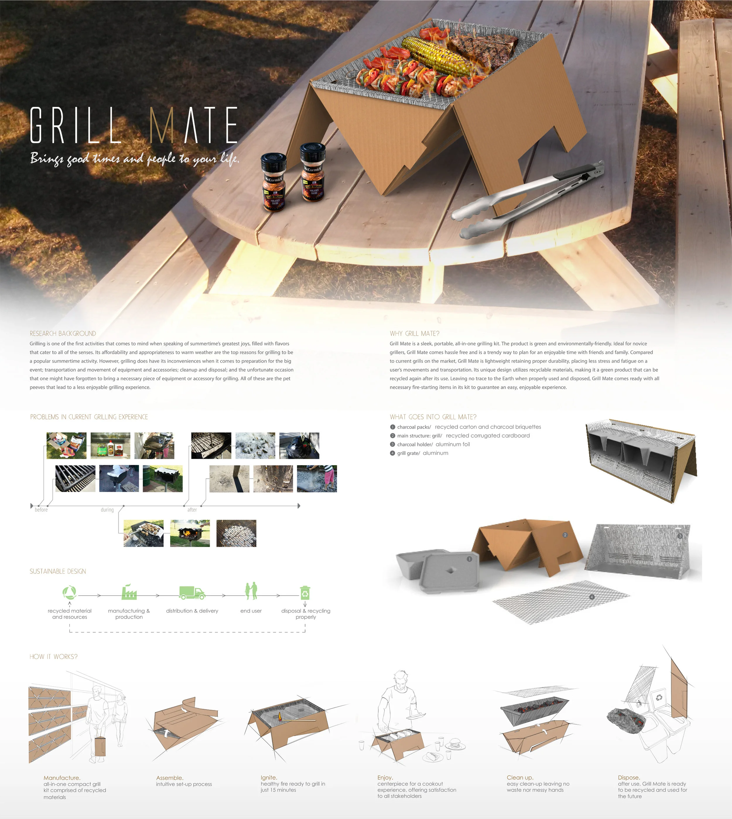 Grill Mate is a sleek, portable, all-in-one grilling kit. The product is green, environmentally-friendly and ideal for novice grillers. Grill Mate comes hassle free and is a trendy way to plan for an enjoyable time with friends and family. It comes ready with all necessary fire-starting items in its kit to guarantee an easy, enjoyable experience.